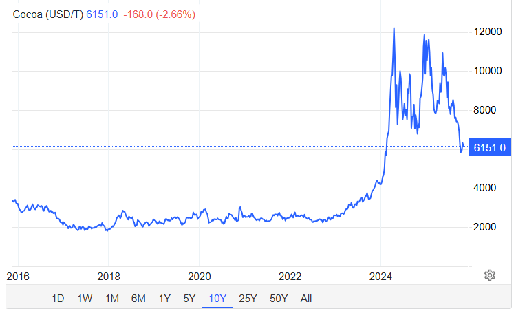 Global cocoa prices have fallen from their 2024 high, but are still wild, with beans up roughly 3x from their 2023 prices. The insane prices are driven by poor harvests in West Africa (where roughly 70% of the world’s cocoa comes from), drought conditions linked to El Niño, ageing trees, crop disease, and freight costs.